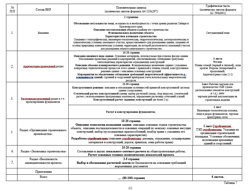 Ниже представленная таблица 7 приводится в помощь студенту и позволяет быстро сформировать его общее представление о ВКР, содержании и объеме разделов пояснительной записки и их графического оформления.