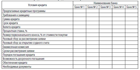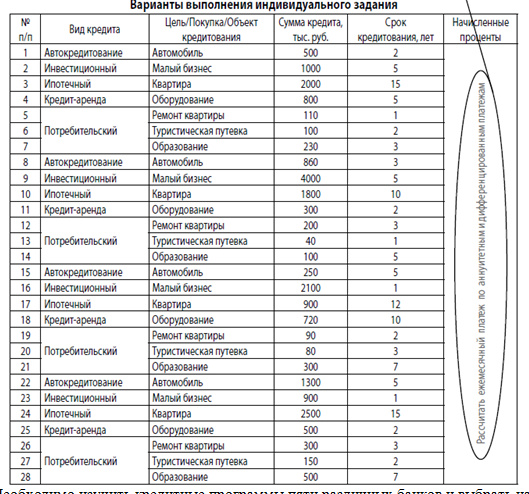 При выполнении индивидуального задания следует придерживаться вышеуказанной памятки заемщику. Необходимо определить для себя существенные условия кредитного договора и выбрать наиболее подходящий для себя банк. Существенными условиями могут быть не только низкая процентная ставка по кредиту, кредит без обеспечения, но и минимальное количество предоставляемых документов, рассмотрение заявки в течение одного дня, досрочное погашение кредита и т. п. При выборе коммерческого банка необходимо знать, что декларируемая процентная ставка по кредиту отличается от реальной итоговой процентной ставки (эффективная процентная ставка), которую