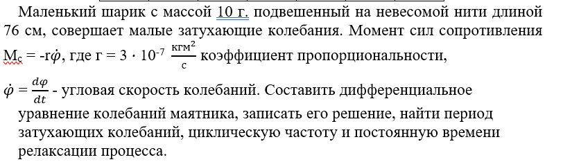 φ ̇ = dφ/dt - угловая скорость колебаний. Составить дифференциальное уравнение колебаний маятника, записать его решение, найти период затухающих колебаний, циклическую частоту и постоянную времени релаксации процесса.