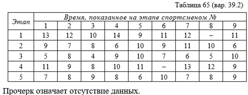 При подготовке к эстафете определились результаты на этапах всех кандидатов в команду (табл. 65). На основании этих данных необходимо определить состав команды и расстановку спортсменов по этапам.
