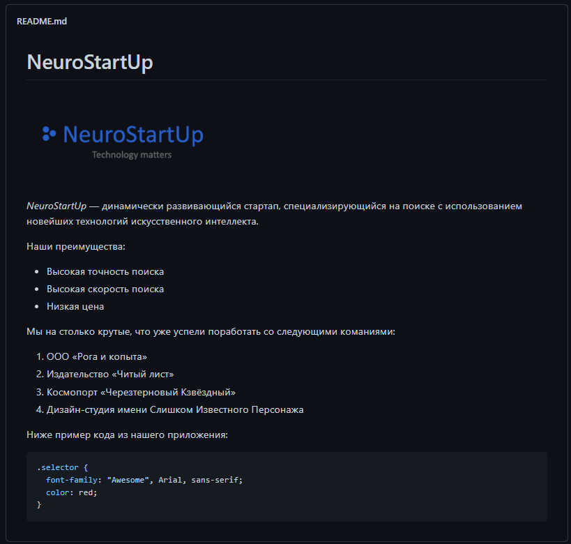 - Форматируйте добавленный код чтобы набор компаний партнёров получился упорядоченным списком, а код был отделён тремя бектиками (символ обратной кавычки) перед кодом (с названием ) и после него. В качестве названия технологии используйте css на строке с тремя бектиками перед началом кода. Пример форматирования из самого файла с описанием задания в markdown