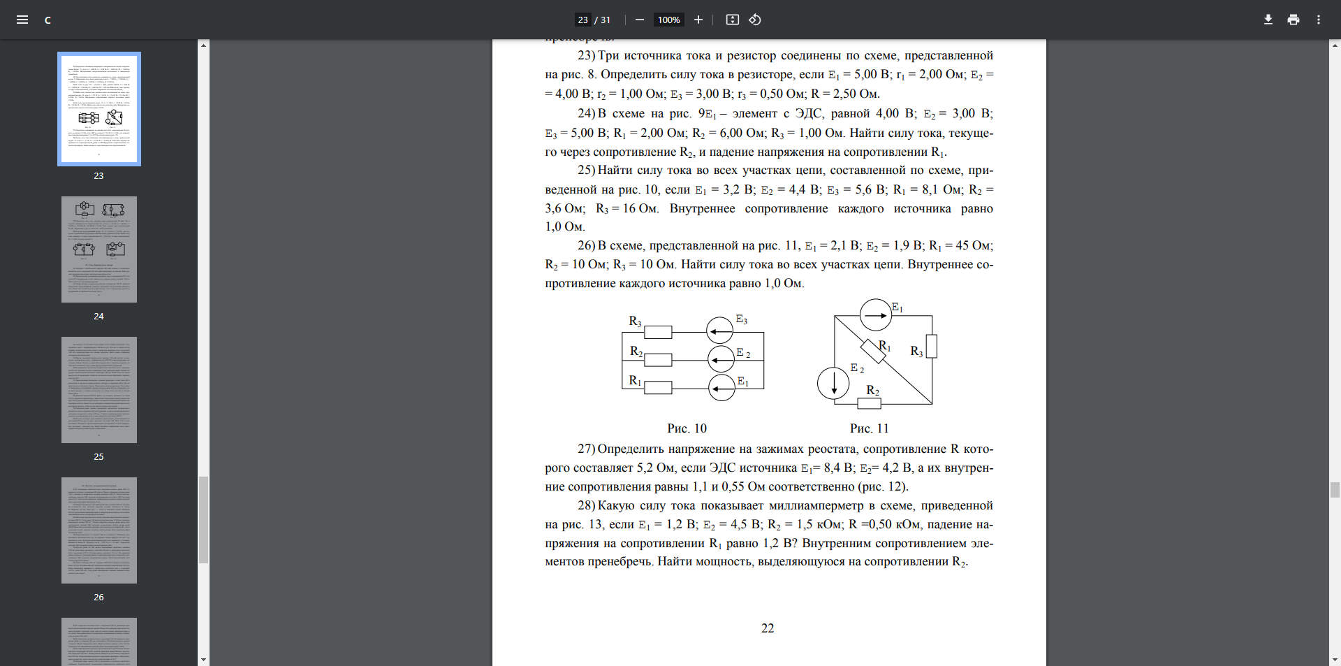 25) Найти силу тока во всех участках цепи, составленной по схеме, приведенной на рис. 10, если E1 = 3,2 В; E2 = 4,4 В; E3 = 5,6 В; R1 = 8,1 Ом; R2 = 3,6 Ом; R3 = 16 Ом. Внутреннее сопротивление каждого источника равно 1,0 Ом