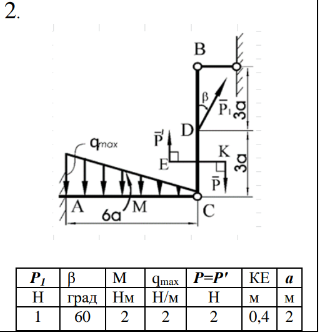 найти реакции опор А и В двух невесомых балок АС и ВС, а также усилия в их соединительном шарнире С. В точке С балки соединены с помощью плоского шарнира. На конструкцию действует плоская система сил, величины которых заданы в таблице исходных данных.