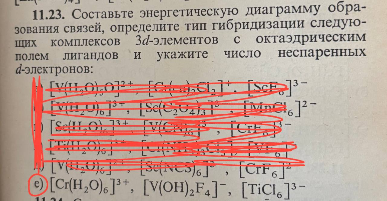 e) Составьте энергетическую диаграмму образования связей, определите тип гибридизации следующих комплексов 3d-элементов с октаэдрическим полем лигандов и укажите число неспаренных d-электронов. [Cr(H2O)6]^3+, [V(OH)2F4]^-, [TiCl6]^3-