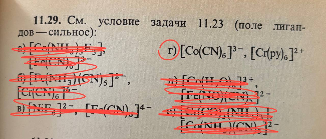 г) Составьте энергетическую диаграмму образования связей, определите тип гибридизации следующих комплексов 3d-элементов с октаэдрическим полем лигандов и укажите число неспаренных d-электронов. (поле лигандов сильное). [CO(CN)6]^3-, [Cr(ру)6]^2+