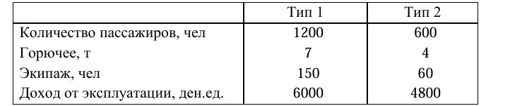 Необходимо обеспечить перевозку 45000 пассажиров. Компания располагает 330 т горючего, общая потребность в рабочей силе не может превосходить 5400 человек. Составить план использования судов, который даст наибольший доход.