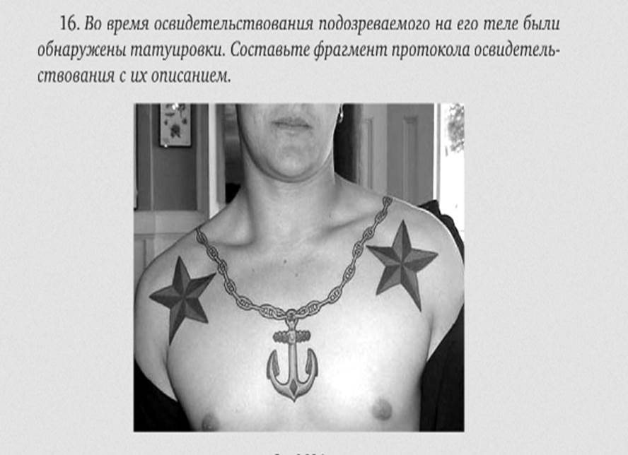 Во время освидетельствования подозреваемого на его теле были обнаружены татуировки. Составьте фрагмент протокола освидетельствования с их описанием.