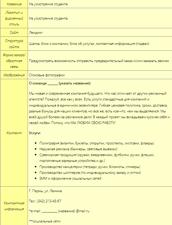 Ситуация: Вам поручено разработать лэндинг (одностраничник) для рекламного агентства. Заказчик предоставил заполненный бриф.