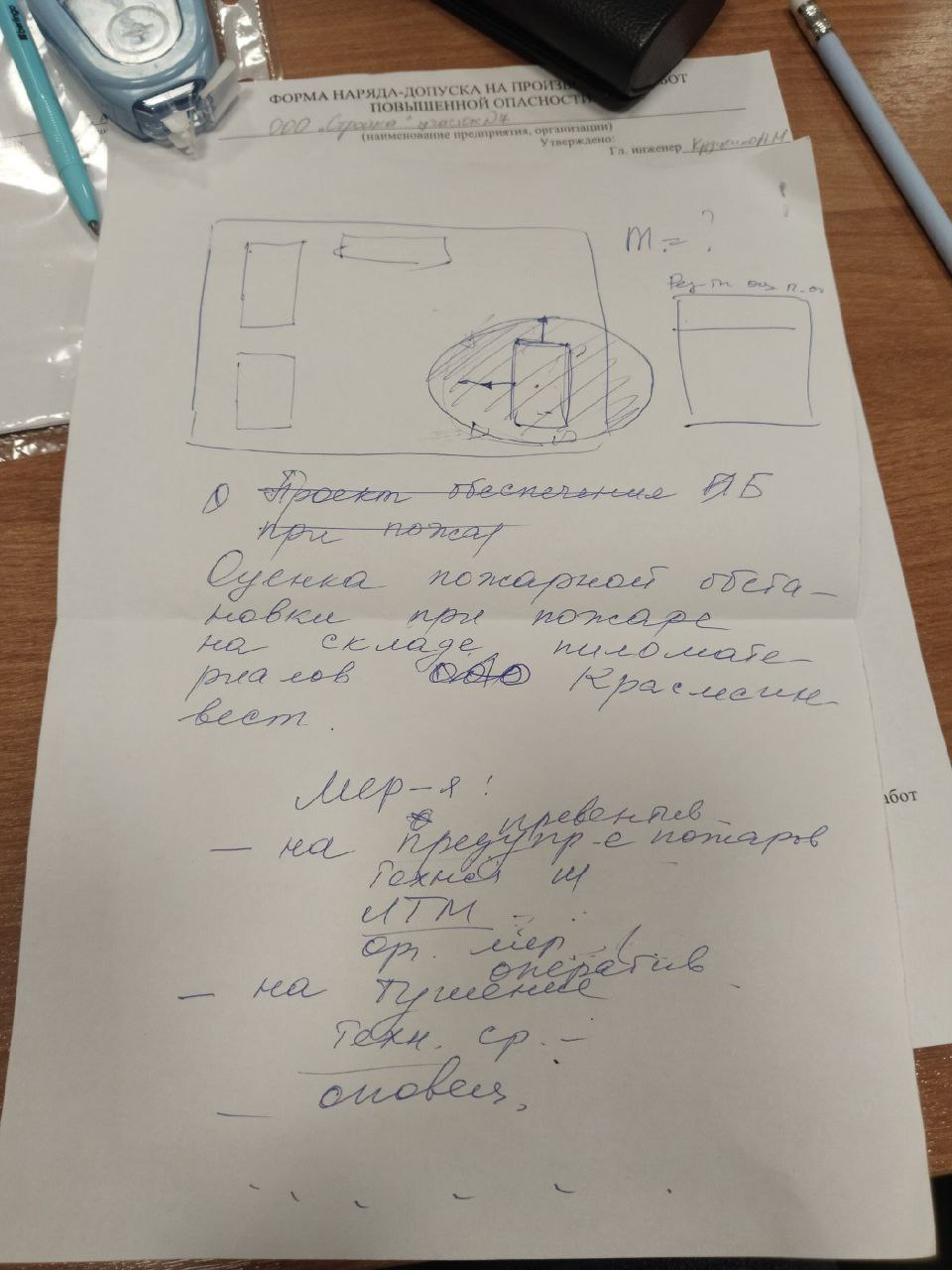 Вот ещё преподаватель начертил "чертёж" возник пожар на складе и , что будет от теплового удара, что может навредить.