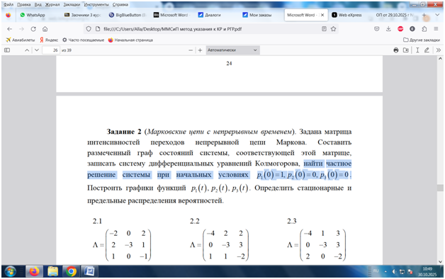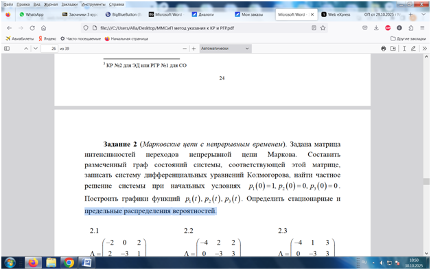 Нужно решить задания подробно. Задание №1, №2 на стр. 24-25 ( 7.2 Марковские процессы) в методических указаниях к КР и РГР, 5 вариант, число потоков 1. Также добавлены файлы в которых выделено, что не нужно выполнять в задачах
