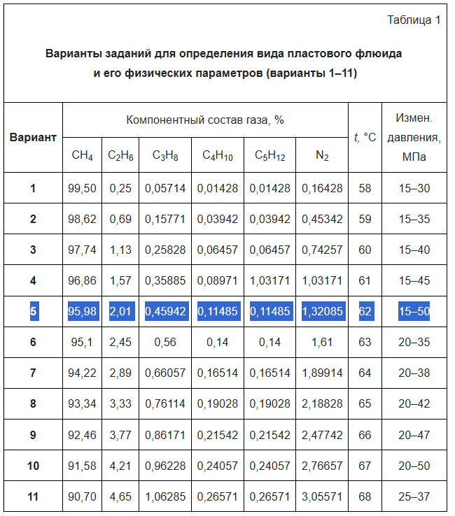 Задача 1. Установить вид пластового флюида и его физические параметры по компонентному составу отобранных проб газа, температуре и интервалу изменения давления на забое скважины . При этом необходимо учитывать рассчитанные по опытным данным соотношения углеводородных газов, характерные для газовых, газоконденсатных и нефтяных залежей. В результате должны быть определены, например, такие физические параметры, как молекулярная масса газовой смеси, вязкость природного газа при атмосферном давлении, объёмный коэффициент и вязкость нефти.