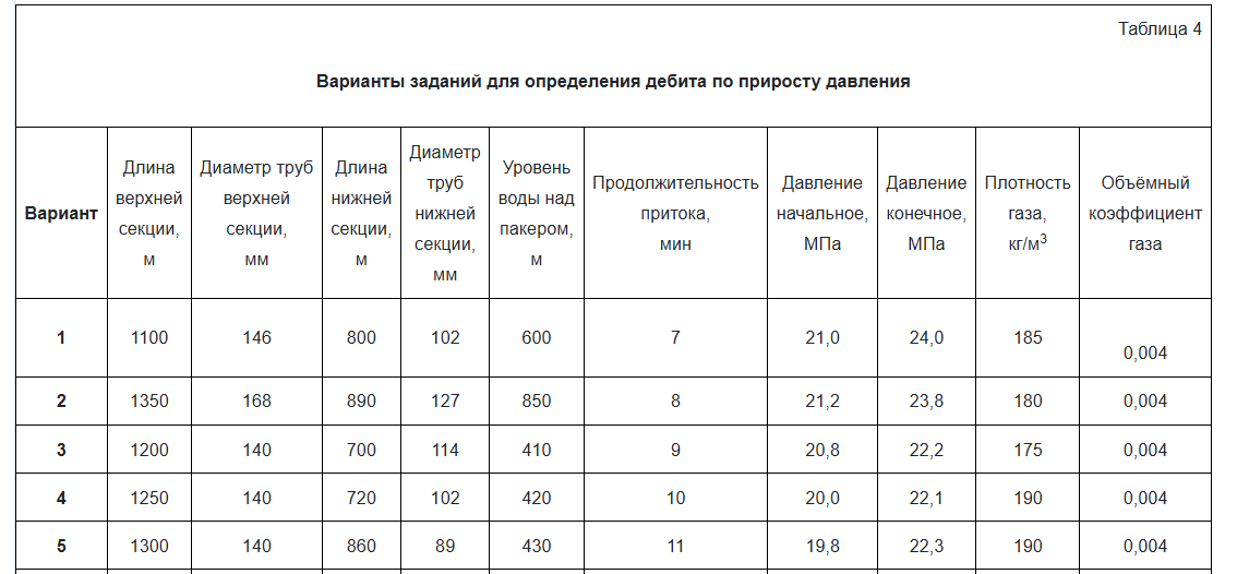 2. По приросту давления (табл. 4), зафиксированному в колонне бурильных труб, предварительно частично заполненной заливочной жидкостью (водой). Давление возрастает за счёт кратковременного доступа в колонну флюида из залежи.