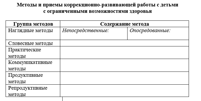 2. Заполните таблицу «Методы и приемы коррекционно-развивающей работы с детьми с ограниченными возможностями здоровья», отразив разные группы методов.