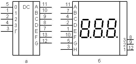 В качестве микросхем индикаторов будем использовать два семисегментных одноцветных индикатора КИПЦА38-3/8. Для управления схемами индикации необходимо устройство, преобразующее двоичный код на выходах счетчиков в код управления индикатором. Таким устройством является дешифратор. Совместно с КИПЦ38А-3/8 применяется дешифратор К514ИД1. Он представляет собой четырех разрядный дешифратор для семисегментных полупроводниковых цифровых индикаторов с разъединенными анодами сегментов. Условное графическое обозначение К514ИД1 представлено на рис. 3.а, КИПЦ38А-3/8 на рис. 3.б.
