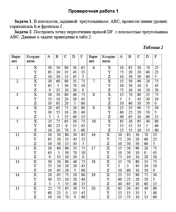 Проверочная работа 1 Задача 1. В плоскости, заданной треугольником АВС, провести линии уровня: горизонталь h и фронталь f . Задача 2. Построить точку пересечения прямой DF c плоскостью треугольника АВС. Данные к задаче приведены в табл.2.