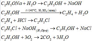 The reaction sequence provided is as follows:C2H5OH (ethanol) undergoes dehydration to form C2H4 (ethylene) by losing a water molecule.C2H4 (ethylene) reacts with HCl to form C2H5Cl (chloroethane) by adding a chlorine molecule.C2H5Cl (chloroethane) undergoes hydrolysis to form C2H5OH (ethanol) by breaking the C-Cl bond and replacing it with an -OH group.C2H5OH (ethanol) reacts with NaOH (sodium hydroxide) to form C2H5ONa (sodium ethoxide) by replacing an -OH group with a sodium ion.
