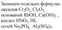 Выпишите отдельно формулы, оксидов, оснований, кислот и солей: HNO3, Na3PO4, Cl2O5, Cu(OH)2, Cr2O3, Al2(SO4)3, HI, RbOH