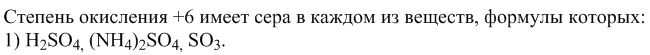 окисления +6 имеет сера в каждом из веществ, формулы которых: 1) H2SO4, (NH4)2SO4, SO3; 2) SO2, H2S, SO3 3) H2SO3, SO3, K2SO4 4) SO3, Na2SO4, H2SO3.